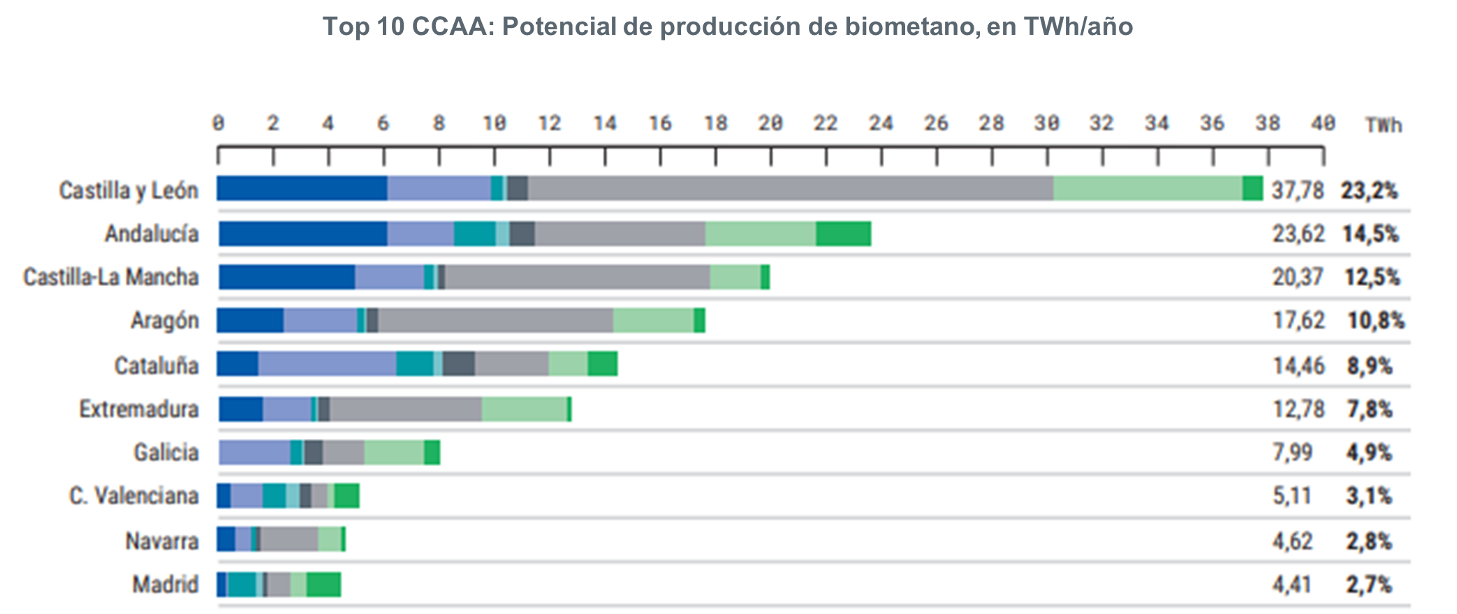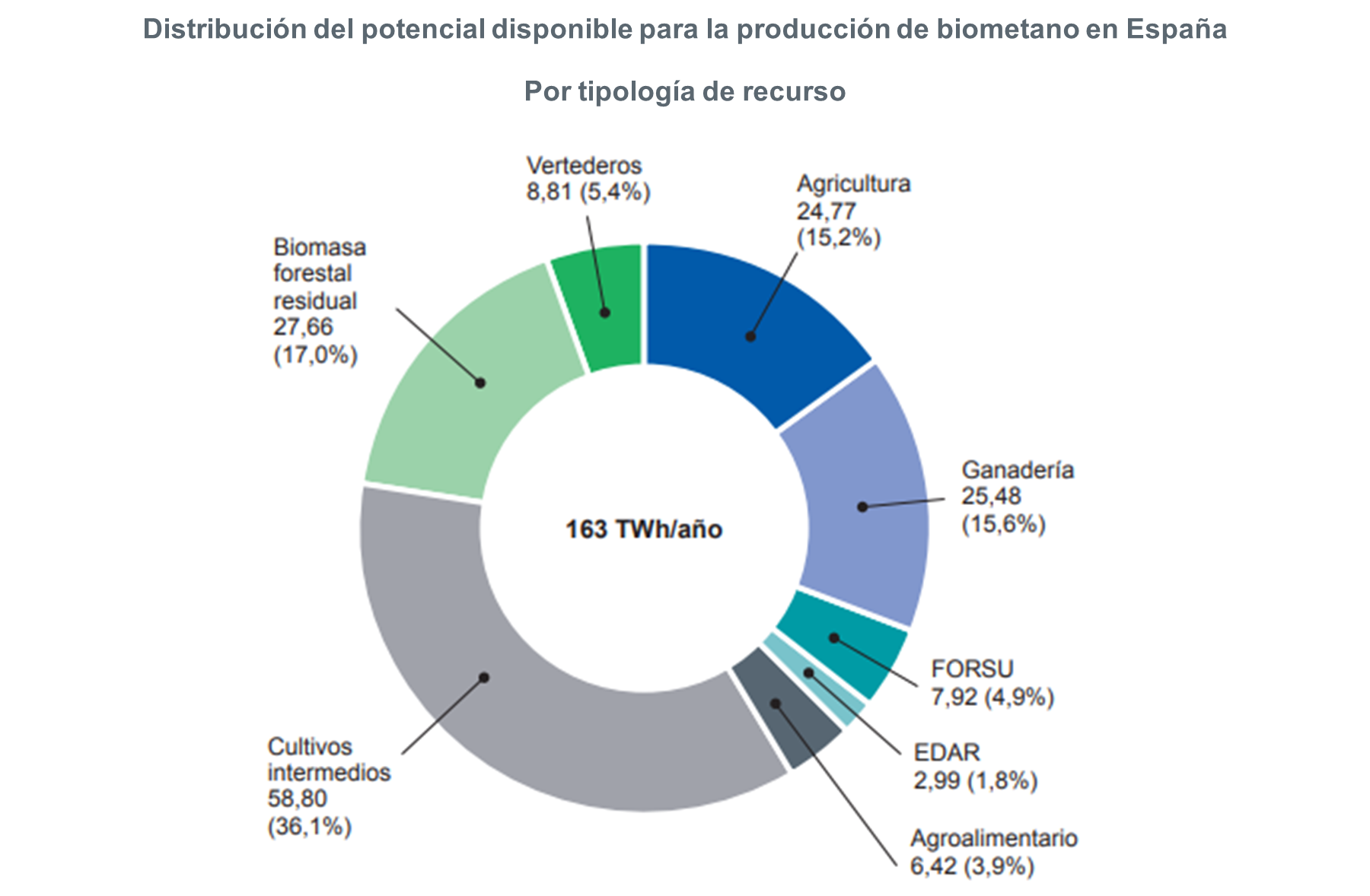El análisis llevado a cabo en el marco del estudio actualiza las últimas cifras disponibles, calculadas en 2018 por el Instituto de Diversificación y Ahorro de la Energía (IDAE), que situaban el potencial disponible de biometano entre los 20 y 34 TWh anuales en el año 2030, lo que podría suponer entre un 5% y un 9% de la demanda anual gas. Esta diferencia se debe a que las estimaciones de IDAE no incluyeron ni los cultivos intermedios, ni los residuos forestales y otros biológicos de más difícil aprovechamiento, con un gran potencial, que sí han sido considerados en el estudio. Aún así, el estudio estima un potencial mucho más elevado de los estimado por IDAE, puesto que la parte excluida del potencial estimado por el IDAE, correspondiente a cultivos intermedios, biomasa forestal residual y el biogás de vertedero alcanza los 95,27 TWh/año, lo que supone un 58,5% del total. La parte restante por lo tanto sumaría unos 67,59 TWh/año, notablemente superior a las estimaciones más optimistas del IDAE (20-34 TWh/año)