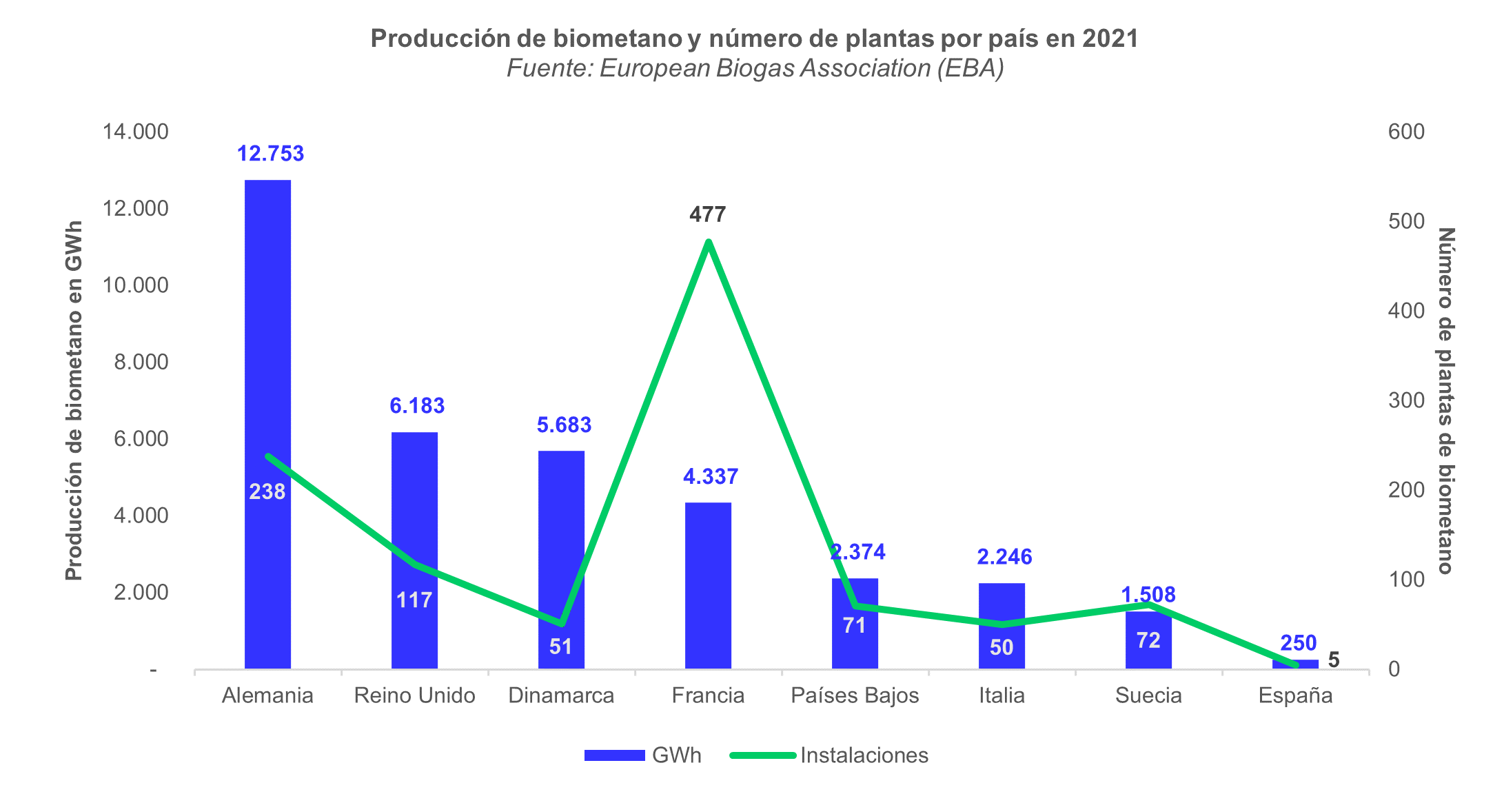De acuerdo con un estudio, elaborado por la Asociación Española del Gas, Sedigas, en colaboración con PwC y la consultora especializada Biovic, España tiene un potencial de producción de biometano de 163 TWh/año, lo que permitiría cubrir alrededor del 45% de la demanda nacional de gas natural. El desarrollo de este potencial habría supuesto un ahorro de hasta 4.000 M€ para los consumidores en 2022. Para producir esta cantidad de biometano serían necesarias más de 2.300 plantas, cuya construcción supondría una inversión de casi 40.500 M€, así como la creación de cerca de 62.000 empleos, entre directos e indirectos, asociados a su operación y mantenimiento.