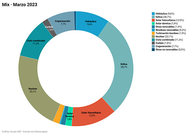 La generación proveniente de fuentes renovables ha representado el 54,6% del mix, frente al 47,1% de marzo del año pasado por el aumento de eólica y fotovoltaica. La eólica y la nuclear han liderado el mix de generación de marzo y, a lo largo del mes, la eólica ha dominado el mix todas las horas, salvo las de radiación solar, en las que ha predominado la fotovoltaica.