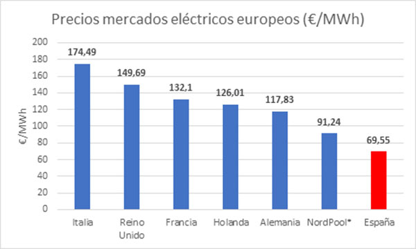 Como se puede ver en el gráfico, el mercado eléctrico español ha sido el más barato entre los principales mercados europeos: