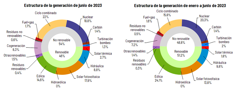 Las renovables generaron este mes de junio un 6,4% más que en el mismo mes de 2022 y registraron 9.851 GWh, lo que supone una cuota del 46% del total de la producción, según datos disponibles a día de hoy. Por otra parte, el 65,6% de la producción eléctrica del mes procedió de tecnologías que no emiten CO2 equivalente.