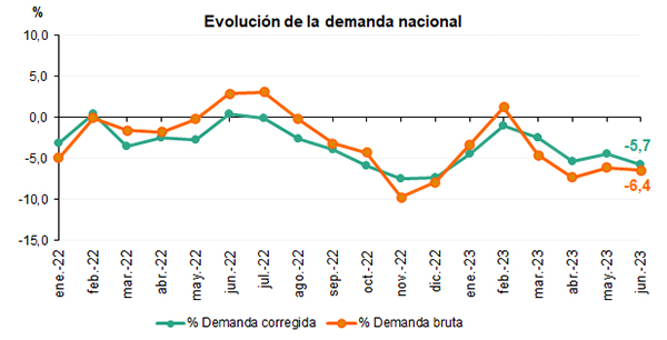 En los seis primeros meses del año, la demanda peninsular ha sido de 112.982 GWh, un 4,6% menos que la registrada en 2022. Una vez tenidos en cuenta los efectos de la laboralidad y las temperaturas, la demanda desciende un 4,1%.