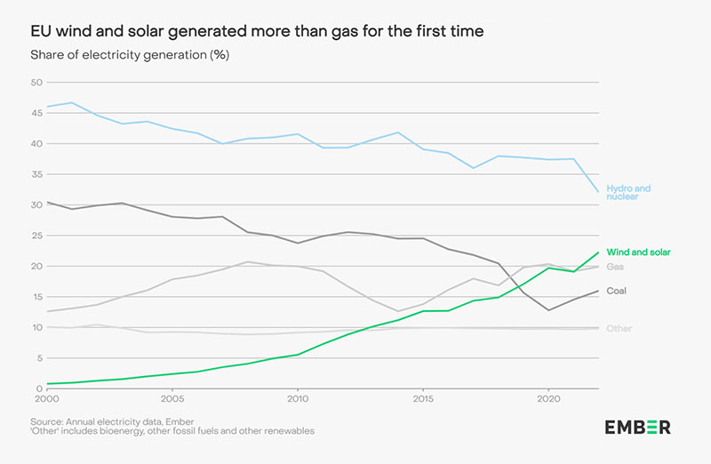 Las energías eólica y solar generaron una cantidad récord, en concreto una quinta parte, o el 22%, de la electricidad de la UE en 2022, superando por primera vez al gas fósil (20%), según el informe European Electricity Review publicado por el grupo de expertos en energía Ember. La participación de carbón en el mix eléctrico europeo aumentó solo 1,5% para generar el 16% de la electricidad de la UE en 2022, con caídas respecto al año anterior en los últimos cuatro meses de 2022.