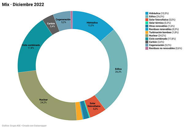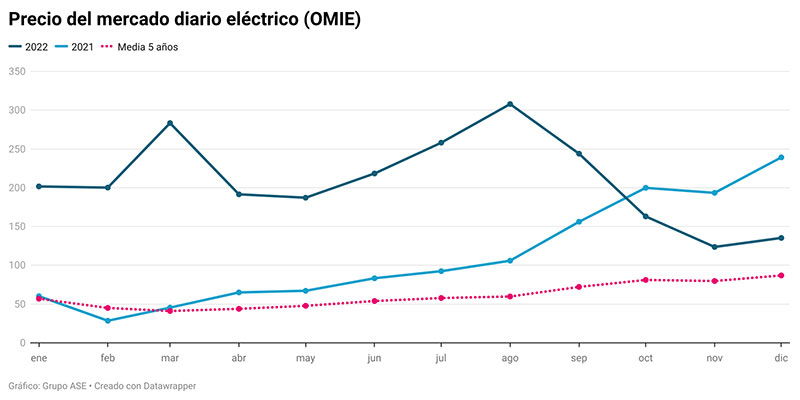 El precio diario del mercado mayorista (pool) español de diciembre se ha situado en 96,95 €/MWh. Añadiendo el sobrecoste que supone para los consumidores del ajuste por el tope al gas (38,34 €/MWh), cierra diciembre a 135,29 €/MWh. Esto supone una subida del 9,4% frente a noviembre, pero es un 43,4% más bajo que el de hace un año. Por su parte, el año 2022 cierra con un precio medio de 209,69 €/MWh (ya sumado el tope al gas), un 88,3% más caro que 2021 y un 246,5% más elevado que el promedio de los últimos cinco años.