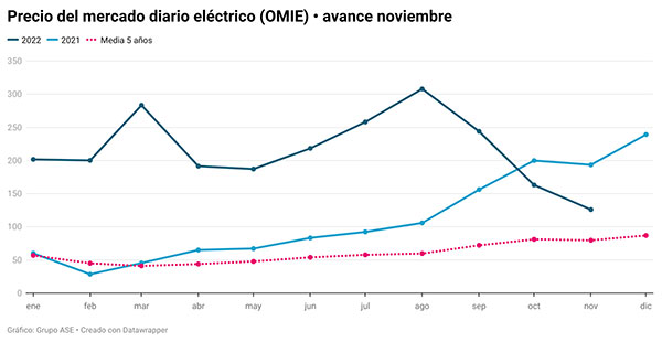 Grupo ASE ha publicado el avance de su informe energético correspondiente al mes de noviembre, en el que pone de manifiesto que el consumo de electricidad cae a niveles cercanos a los del confinamiento por el alto precio y las elevadas temperaturas. Por otra parte, el precio del gas en España está por debajo del europeo y reduce el impacto del mecanismo de ajuste del precio al tope al gas. La producción eólica y la reactivación de Almaraz II limitan la aportación de los ciclos combinados de gas. Un clima suave contendrá los precios a medio plazo, pero a largo plazo cualquier imprevisto puede dispararlos.