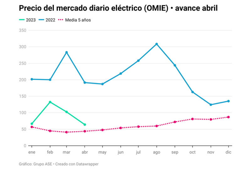 El precio diario del mercado mayorista (pool) español hasta el día 19 de abril se sitúa en 64,05 €/MWh. Baja un 28,35% frente a marzo y un 66,6% respecto a hace un año. El ajuste por el coste del “tope del gas” ha sido cero porque la cotización del gas en MIBGAS (40,10 €/MWh) ha estado por debajo del límite de 60 €/MWh.