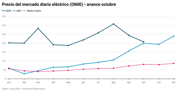 Hasta el 17 de octubre, el precio diario del mercado mayorista español se ha situado en 142,92 €/MWh. Añadido el sobrecoste por el mecanismo de tope al gas para generación eléctrica (64,78 €/MWh), asciende a 207,69 €/MWh y baja un 32,5% respecto a septiembre. Según explican los analistas de Grupo ASE, el descenso del precio del gas en España (MIBGAS) modera el importe del ajuste de compensación que en septiembre fue de 102,56 €/MWh y en agosto de 153,34 €/MWh.