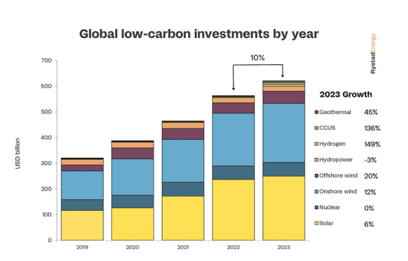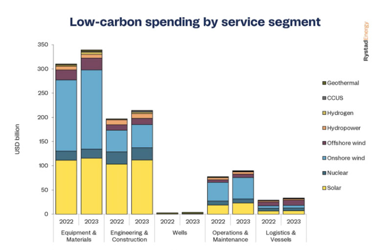 Las inversiones en las industrias: geotérmica, de captura, utilización y almacenamiento de carbono (CCUS), del hidrógeno, de la energía hidroeléctrica, de la eólica marina y terrestre, nuclear y solar alcanzarán los 620.000 M$ en 2023, frente a los 560.000 M$ invertidos el año pasado. Los segmentos de servicio incluidos en el estudio de Rystad Energy incluyen equipos y materiales, ingeniería y construcción, pozos, operación y mantenimiento y logística y buques.
