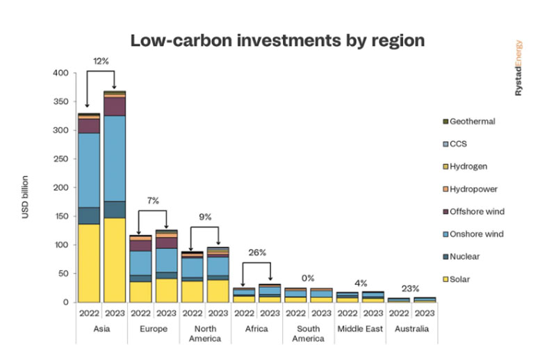 El crecimiento asiático del 12% se ve fuertemente afectado por las ambiciones de China en solar y eólica, mientras que la Ley de Reducción de la Inflación de EE.UU. y el aumento en las renovables y la tecnología CCUS ayudarán a impulsar las inversiones en Norteamérica un 9% este año. Europa se enfrenta al desafío de una alta inflación y una cadena de suministro regional en crisis, lo que resulta en un crecimiento de la inversión proyectado del 7%, mucho más bajo que el ritmo necesario para cumplir con los objetivos REPowerEU de la Unión Europea.