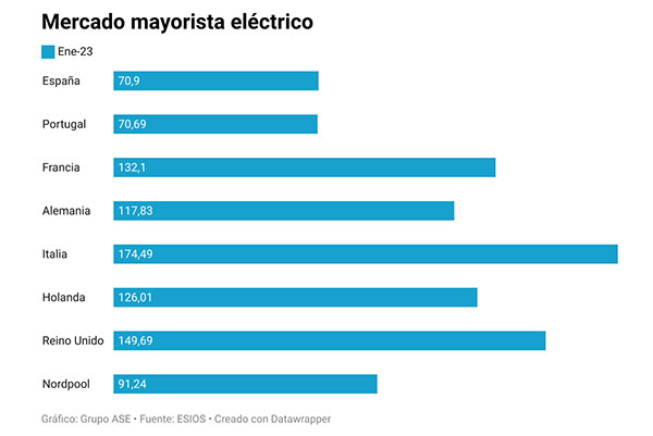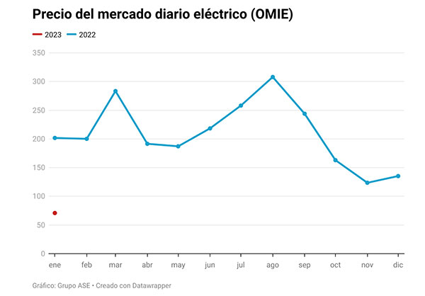 El precio de la electricidad ha descendido en Europa por las altas temperaturas de la primera quincena (que redujeron la demanda energética), por el fuerte aumento de la producción eólica y por la reducción del precio del gas. Así, el precio medio de las grandes economías europeas (Alemania, Francia, Italia y Reino Unido) se ha situado en 140,02 €/MWh, con un descenso del 48,65% frente a diciembre (272 €/MWh).