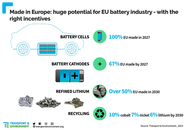Un nuevo informe de Transport & Environment describe cómo la Unión Europea puede usar sus poderes blandos y financieros para construir una cadena de valor del vehículo eléctrico exitosa, eliminando su dependencia de las baterías chinas de Li-ion para 2027 y haciendo frente a los nuevos desafíos que le impone la Ley de Reducción de la Inflación de EE.UU.